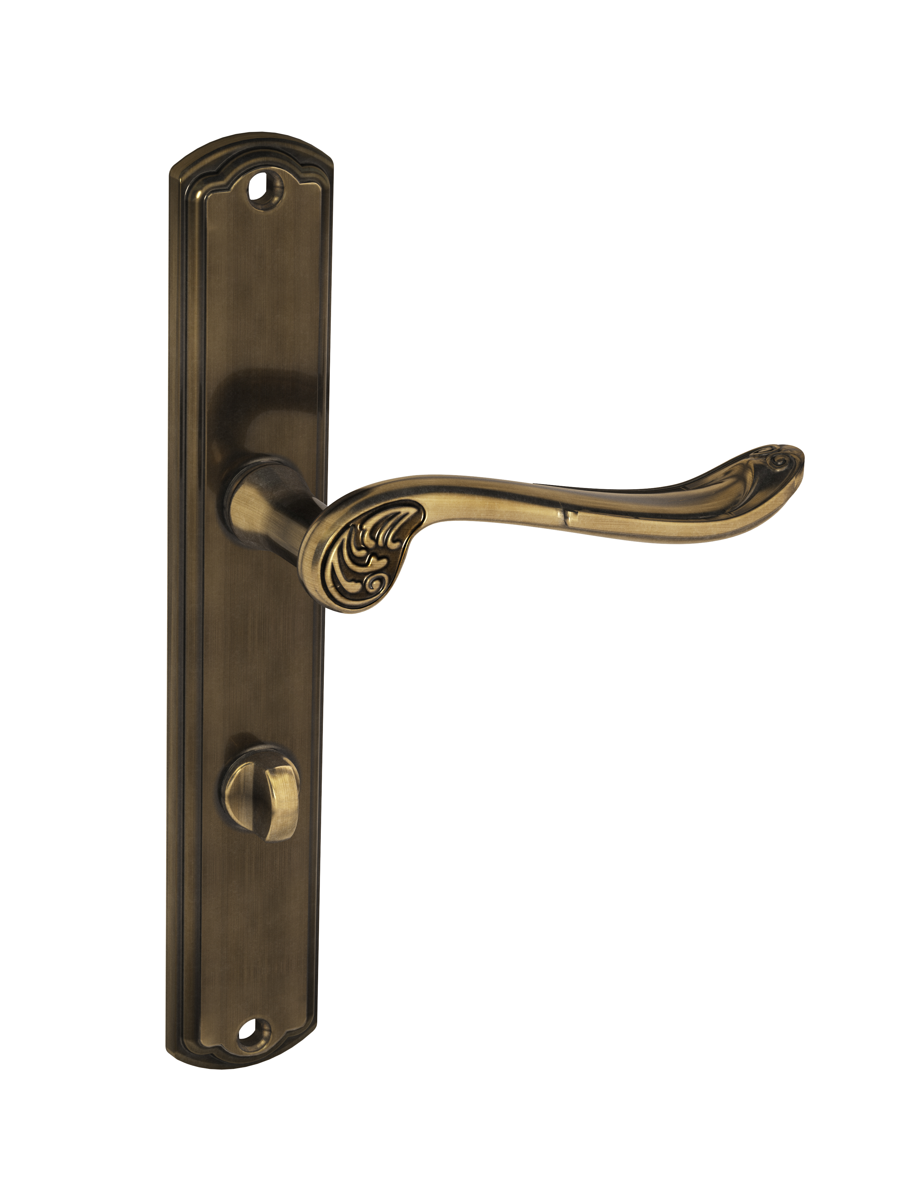 Klamka drzwiowa Nomet Tucana na szyldzie podłużnym 72 mm do WC patyna szlifowana na mosiądzu