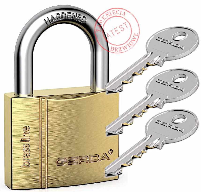 Popularna mosiężna na mały klucz, samozatrzaskowa, produkowana przez firmę Gerda. Kłódka należy do serii kłódek Gerda Brass Line. Do kłódki dołączono 3 klucze.