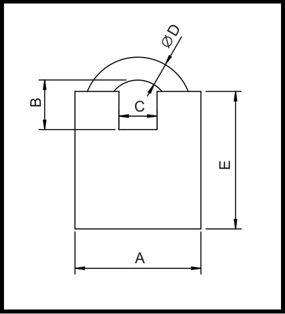 Kłódka wzmocniona znalowa (Zn+Al) na klucz standardowy. Wymiary kłódki: szerokość korpusu 66 mm, średnica pałąka 10 mm. Wg rysunku: A=66, B=26, C=20, D=12, E=52 mm. Kłódka nie jest samozatrzaskowa.