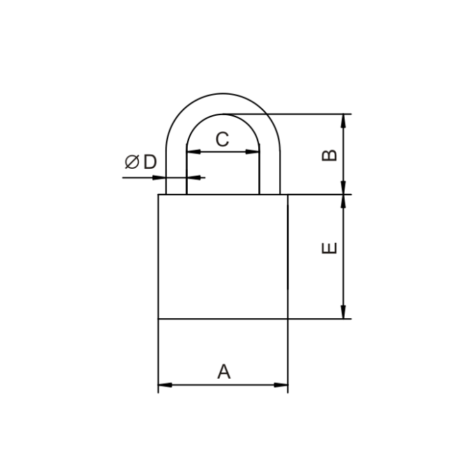 Kłódka aluminiowa (opatentowany stop TITALIUM™). Rozmiar kłódki "30" (szerokość korpusu 30mm). Pałąk stalowy, hartowany o średnicy 5 mm. Zabezpieczająca warstwa antykorozyjna NANO PROTECT. Wg rysunku: A=30, B=17, C=16, D=5.