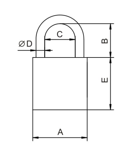 Kłódka stalowa wzmocniona. Szerokość korpusu 57 mm. Pałąk o średnicy 8 mm. Wg rysunku: A=57, B=24, C=19, D=8. Budowa umożliwiająca działanie w warunkach dużej wilgotności.