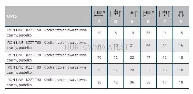 Wymiary kłódki: szerokość korpusu żeliwnego 50 mm, średnica trzpienia 8 mm. Szczegółowe wymiary w tabeli poniżej (wg rysunku w załączeniu).