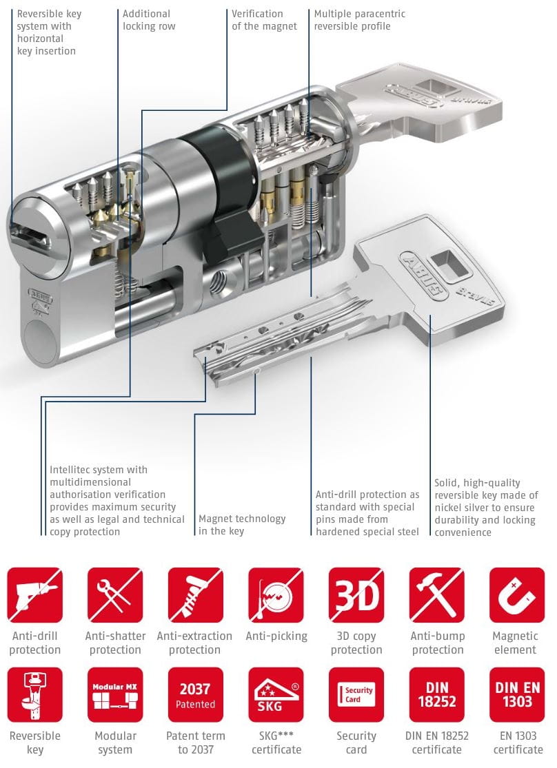 Producent: ABUS. Wykończenie: nikiel. Wkładka typu: klucz-klucz. Standardowy profil wkładki 10 mm. Klucze magnetyczne, nawiercane. W komplecie 5 sztuk kluczy. Najwyższe zabezpieczenie antywłamaniowe. Produkt niemiecki.
