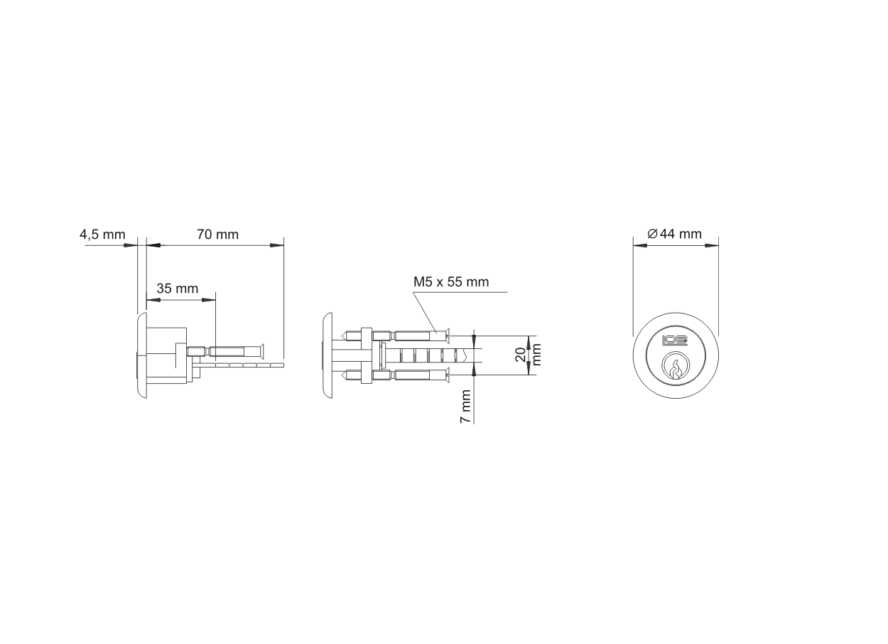 Wkładka mosiężna wierzchnia polskiej produkcji. Średnica tarczy 44 mm, rozstaw śrub mocujących 20 mm. Możliwość dopasowania długości płetwy do grubości drzwi.